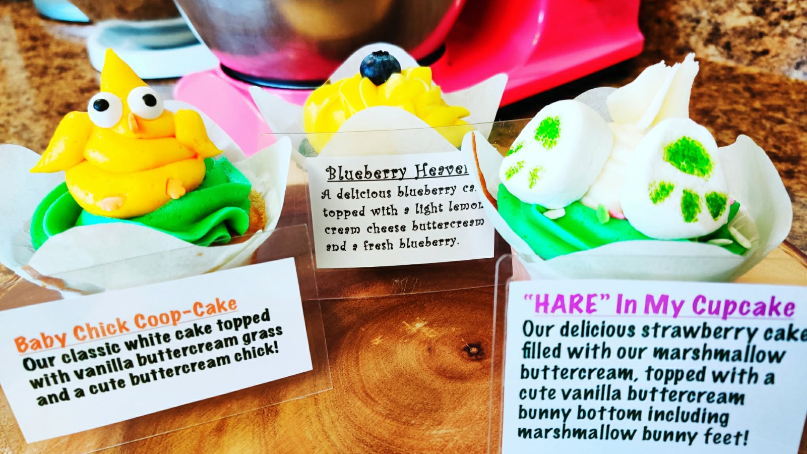 Rich yellow cake with chocolate buttercream and a mini chocolate kiss.